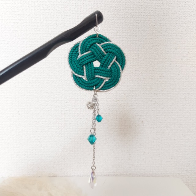 カラッチ(あわじ結び)をモチーフにしたかんざしです。 カラッチ2枚合わせのデザインですので裏表を気にせずに着けていただけます。 身に着けることで、装いに華やかさとエレガンスを加えます。 さりげなく、しかし確かな存在感を放つこと間違いなしです。 お着物や浴衣、特別な日のアクセントや普段のコーディネートにもおすすめです。 メドゥプは韓国の伝統的な技法を用いて丁寧に制作しています。そのため、一つ一つがハンドメイドならではの温かみとクオリティを感じることができます。 カラー:青緑 かんざし長さ:180㎜ 【結びの意味】 《カラッチメドゥプ》あわじ玉/가락지매듭 カラッチは韓国語で指輪。 指輪のように見える輪が人と人を結ぶという思いが込められています。 ※製品の形状や色合いは、写真と実物に若干の差異がある場合がございます。 ※金属アレルギーや皮膚トラブル等が起こらないよう、ご注意ください。 ◆ご使用上の注意◆ 商品の強度には最善を尽くしておりますが落とす、ぶつける、無理な力で引っぱる、重いものを乗せる等、強度の負荷、衝撃を与えますと破損する恐れがありますので、お取り扱いには十分ご注意ください。 着用中、着用後にアレルギー反応が見られる場合は直ちにご使用をお止めください。 症状によっては専門医へのご相談をおすすめいたします。 ◆不具合や破損があった場合はご連絡いただければ、お直しもいたします。 ◆ご不明な点がございましたら、メッセージよりご連絡をお願いいたします。 #メドゥプ #メドゥプアクセサリー #韓国伝統飾り結び #매듭 #액세서리 #목걸이 #飾り結び #組紐 #アジアンノット #水引 #中国結び #韓国 #人と人を結ぶアクセサリー #おとなのおしゃれ #大人女子 #大人女子コーデ #トレンドカラー #ラッキーカラー