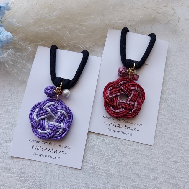 カラッチ(あわじ結び)をモチーフにしたヘアゴムです。 カラッチ2枚合わせのデザインですので裏表を気にせずに着けていただけます。 身に着けることで、装いに華やかさとエレガンスを加えます。 さりげなく、しかし確かな存在感を放つこと間違いなしです。 どんな髪型にも合わせやすく、特別な日のアクセントや普段のコーディネートにもおすすめです。 メドゥプは韓国の伝統的な技法を用いて丁寧に制作しています。そのため、一つ一つがハンドメイドならではの温かみとクオリティを感じることができます。 カラー:すみれ(画左) ガーネット(右) サイズ:35㎜×45㎜(ヘアゴムは含まず) 貴和クリスタル:6㎜ コットンパール:6㎜ 【結びの意味】 《カラッチメドゥプ》あわじ玉/가락지매듭 カラッチは韓国語で指輪。 指輪のように見える輪が人と人を結ぶという思いが込められています。 ※製品の形状や色合いは、写真と実物に若干の差異がある場合がございます。 ※金属アレルギーや皮膚トラブル等が起こらないよう、ご注意ください。 ◆ご使用上の注意◆ 商品の強度には最善を尽くしておりますが落とす、ぶつける、無理な力で引っぱる、重いものを乗せる等、強度の負荷、衝撃を与えますと破損する恐れがありますので、お取り扱いには十分ご注意ください。 着用中、着用後にアレルギー反応が見られる場合は直ちにご使用をお止めください。 症状によっては専門医へのご相談をおすすめいたします。 ◆不具合や破損があった場合はご連絡いただければ、お直しもいたします。 ◆ご不明な点がございましたら、メッセージよりご連絡をお願いいたします。 #メドゥプ #メドゥプアクセサリー #韓国伝統飾り結び #매듭 #액세서리 #목걸이 #飾り結び #組紐 #アジアンノット #水引 #中国結び #韓国 #人と人を結ぶアクセサリー #おとなのおしゃれ #大人女子 #大人女子コーデ #トレンドカラー #ラッキーカラー
