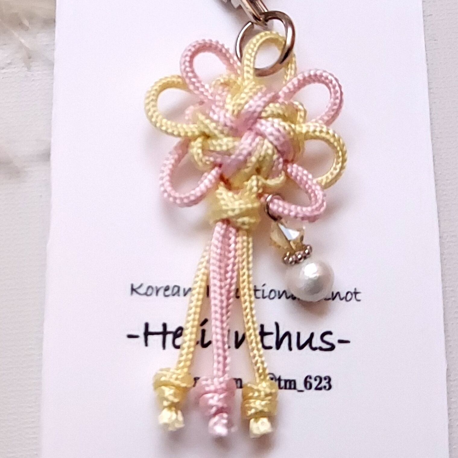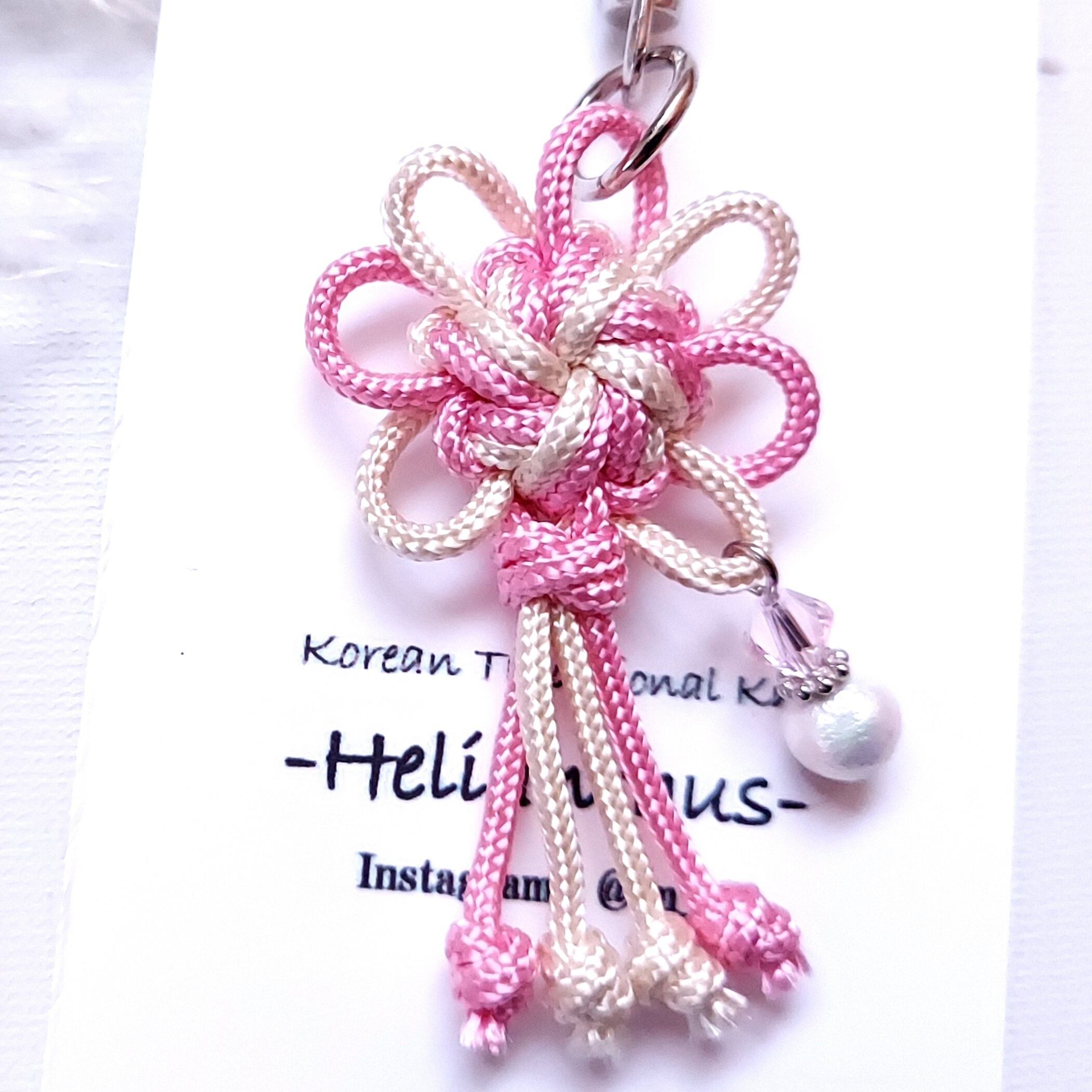 韓国伝統飾り結び『メドゥプ』の技法で作られた、華やかな梅の花をモチーフにした『セボルメファ』のキーホルダーです。