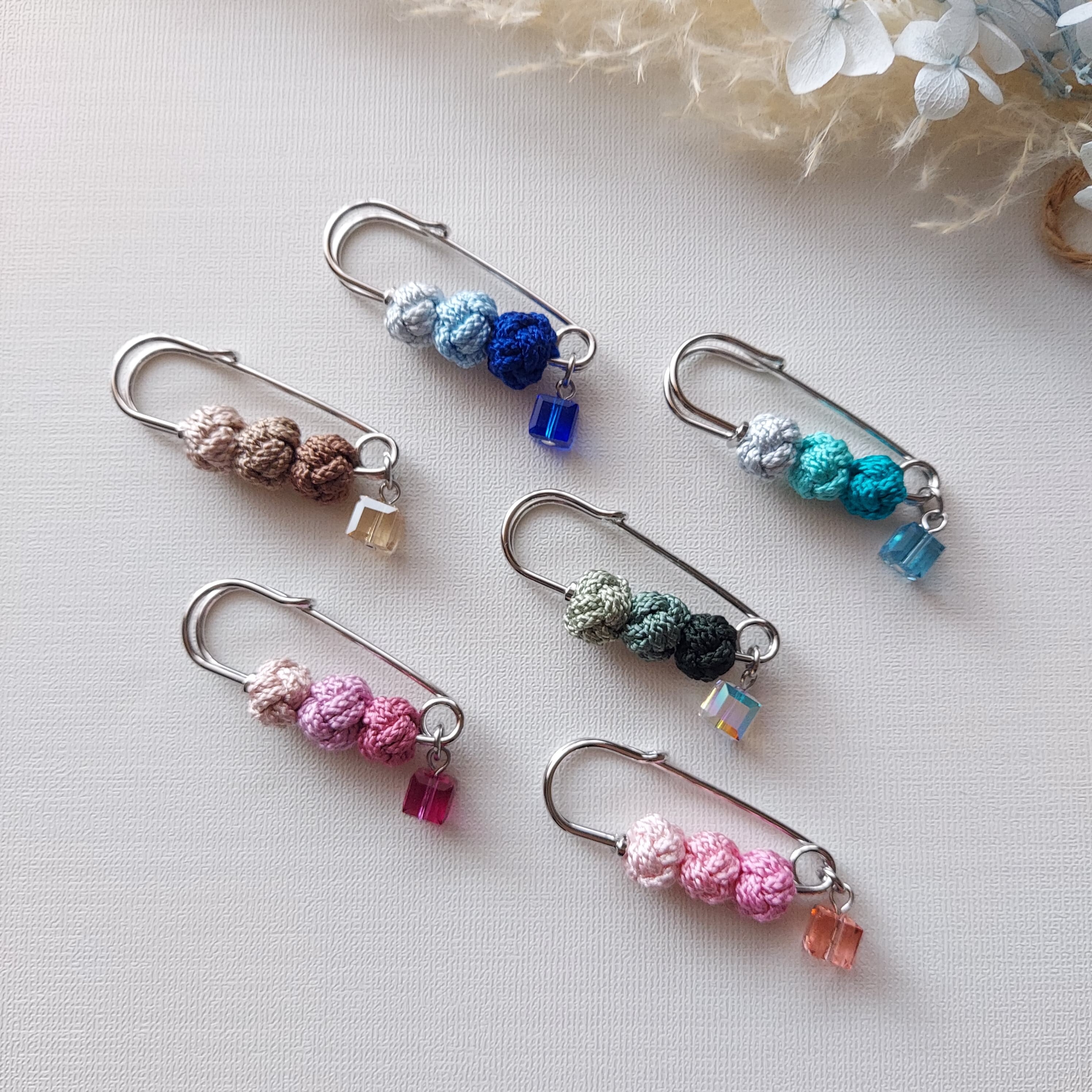 お洋服の胸元やスカーフ留めとしてはもちろん、バッグのアクセントにも。日常の装いに、手仕事の温もりと彩りを添えてみませんか。